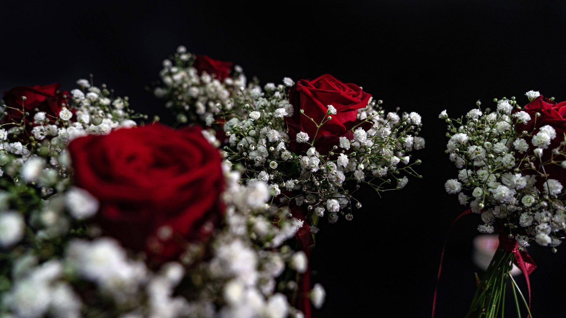 Für einen Valentinstag, der in Erinnerung bleibt: Ein üppiger Rosenstrauß in verschiedenen Rottönen, Kopf an Kopf gebunden und mit Eukalyptus weich abgerundet.